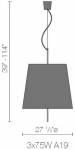 Sumptuous bell shaped fabric shades of black or cream trimmed in metallic gray hang from adjustable supports, creating an elegant yet practical pendant.