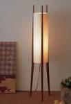 The design of the rumba features triple suooirts of naturally finished west african mahogany wood that rise upwards to embrace a single cotton fabric shade of cream white.
